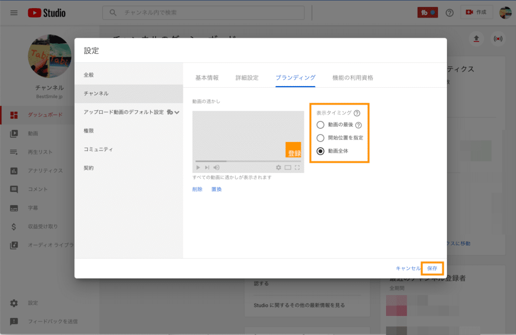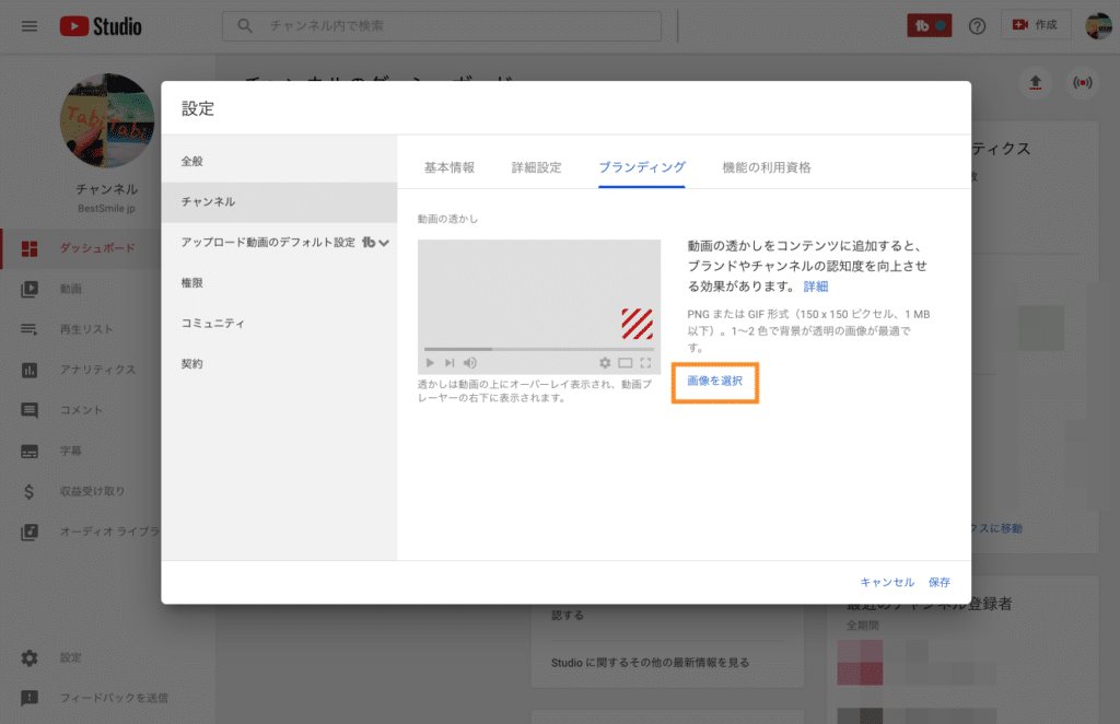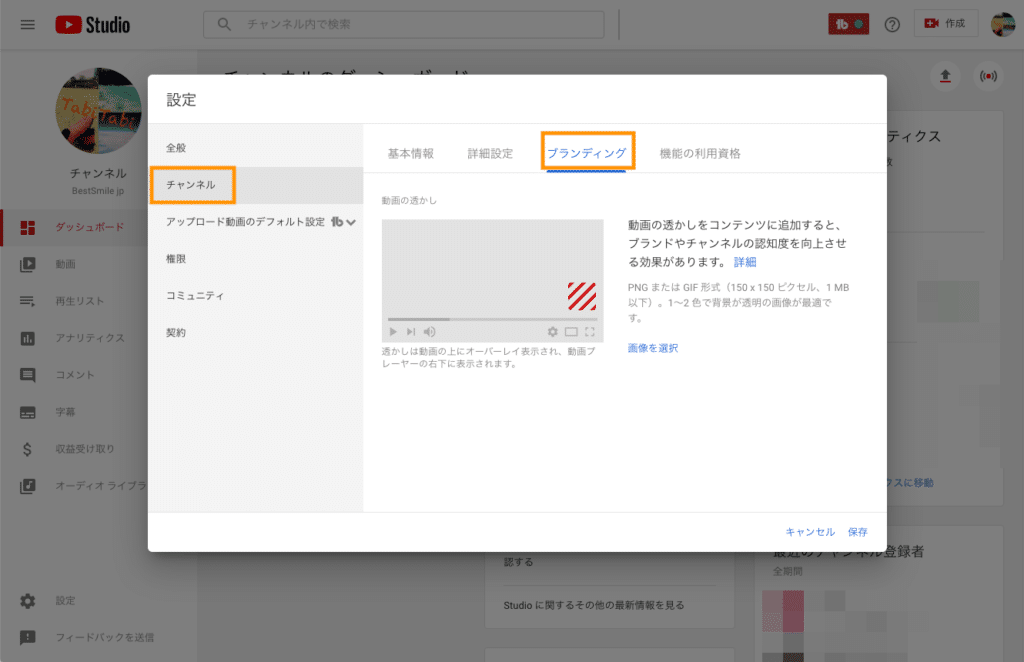 3. 設定の画面で、左側メニューで「チャンネル」をクリックし、「ブランディング」タブをクリックする